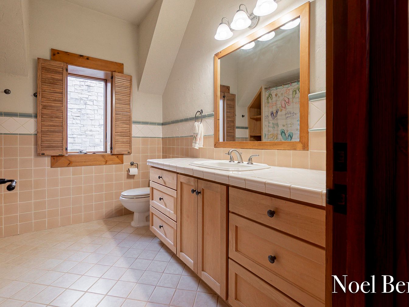 Featuring a thoughtfully designed bathroom with a warm, inviting atmosphere, the space showcases natural wood accents and a soothing color palette of soft beige and white. The elegant tiled flooring complements the wooden cabinetry, providing ample storage with a classic touch. Large, wooden-framed windows shower the area with natural light, while plantation shutters add a rustic charm and privacy. Functional elements include a spacious countertop with dual sinks, ensuring practicality for family use. Architectural details highlight sloped ceilings, enhancing the cozy feel. A delightful butterfly-themed shower curtain adds a playful yet sophisticated finishing touch.