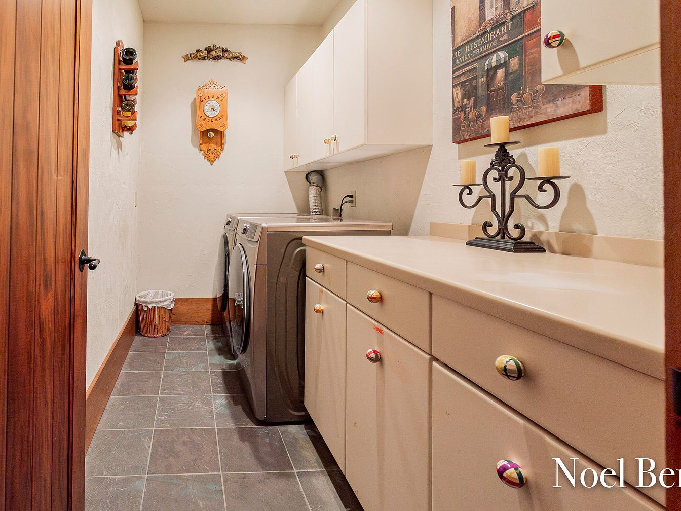 This laundry room seamlessly blends functionality with charm. Featuring ample countertop space, it provides convenience for sorting and folding laundry. The polished tile floor complements the light-colored cabinetry, enhancing the overall spacious feel. Unique knob accents on the cabinets add a playful touch, while the vintage wall clock and candleholder introduce a warm, inviting ambiance. Natural light is welcomed through minimalistic design, ensuring bright and airy conditions. This family-friendly space emphasizes organization with built-in storage, making chores easier, while the design elements create a cozy environment, perfect for integrating home aesthetics with daily routines.