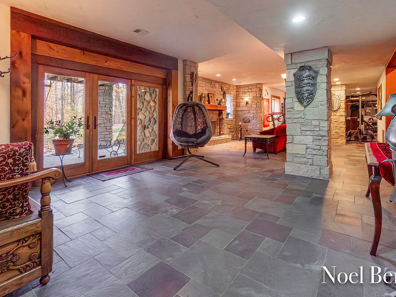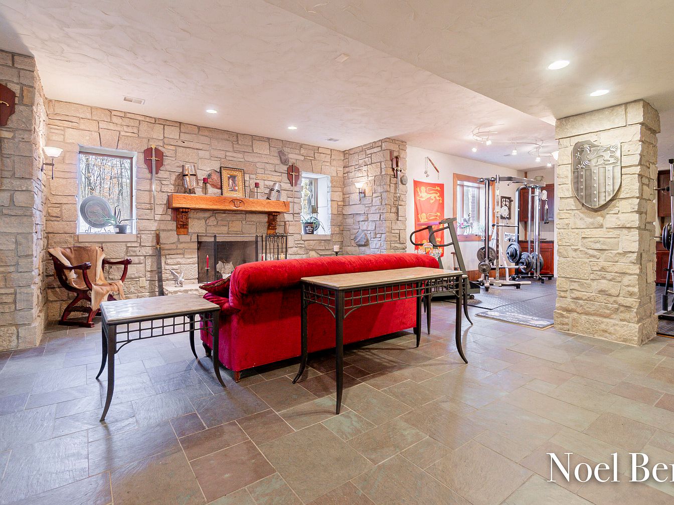 This family room blends rustic charm with contemporary comfort, featuring impressive stone walls that create a cozy, inviting atmosphere. The large red sofa serves as a focal point, complemented by stylish metal and wood furniture that enhances the space’s warmth. A beautiful wooden mantel adds character above the fireplace, perfect for family gatherings and storytelling. Ample natural light floods through the windows, providing a glimpse of the outdoors. Fitness equipment in the background suggests an active lifestyle, making this room ideal for relaxation and recreation, showcasing a versatile design that caters to both leisure and family activities.