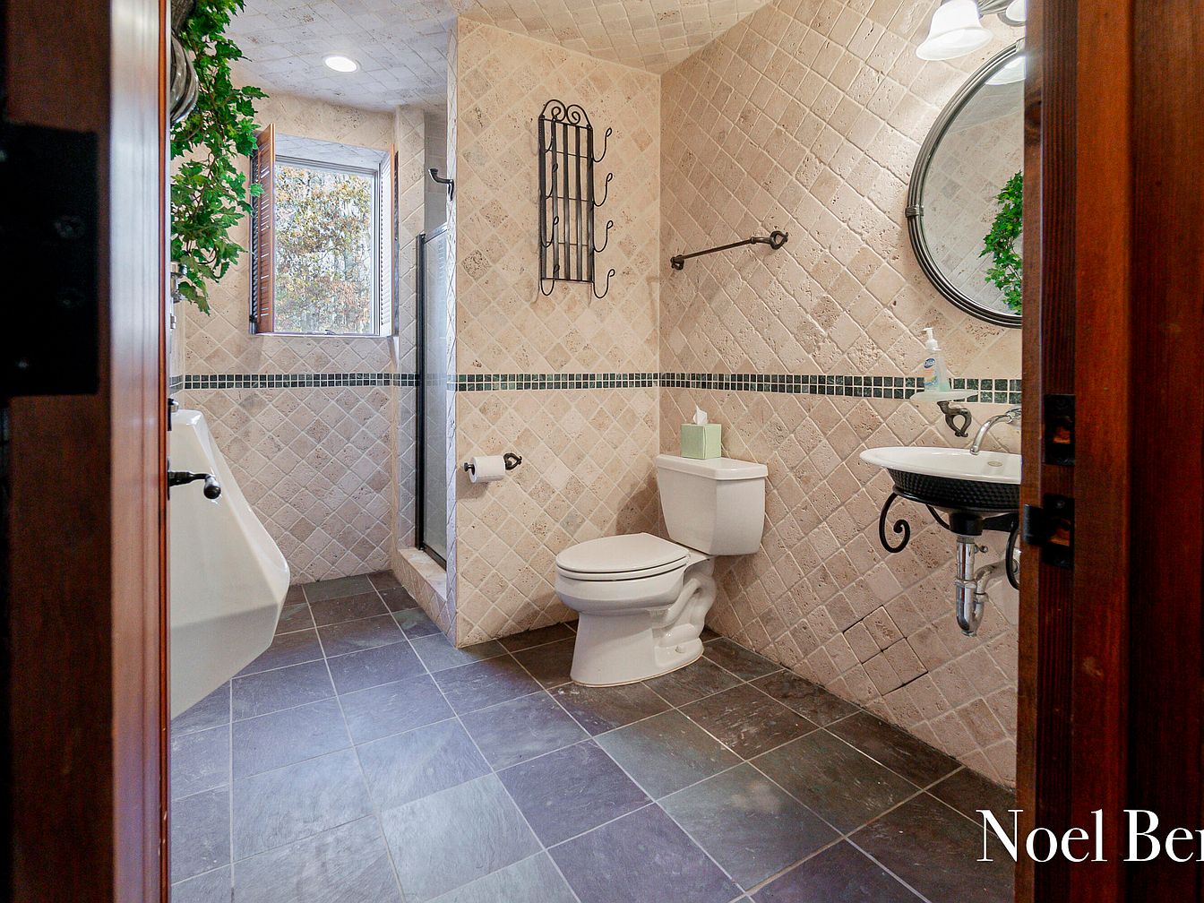 This elegant bathroom showcases a sophisticated layout featuring natural stone tiles that blend seamlessly with the earthy color palette. A combination of textured ceramic tiles and slate flooring offers both style and durability, perfect for family use. The highlights include a modern pedestal sink and a vintage-style toilet, positioned thoughtfully for optimal space utilization. Large windows allow for abundant natural light, enhancing the cheerful ambiance. Decorative elements like a wrought-iron towel rack and greenery introduce organic touches, creating a serene atmosphere. The luxurious shower area features a glass enclosure, promising a delightful retreat for relaxation.