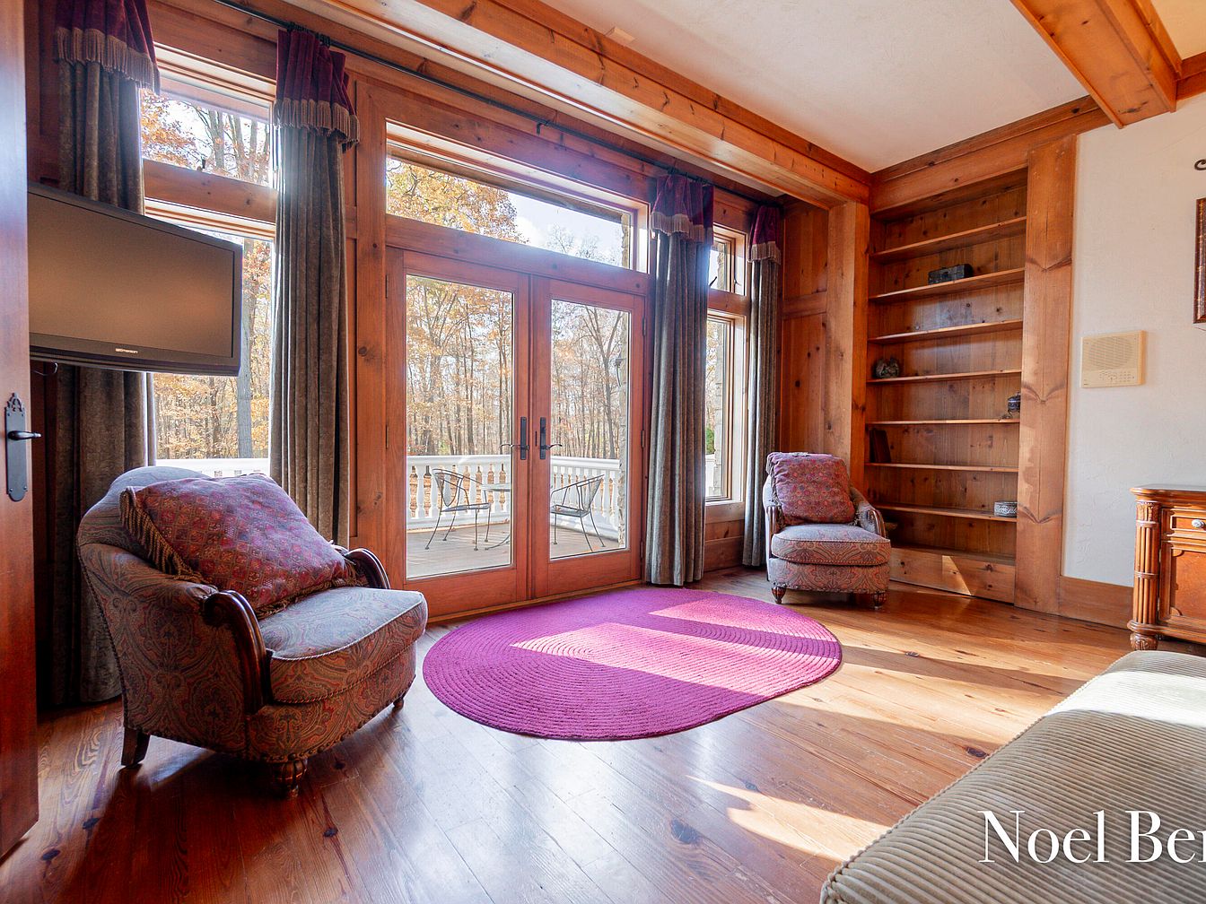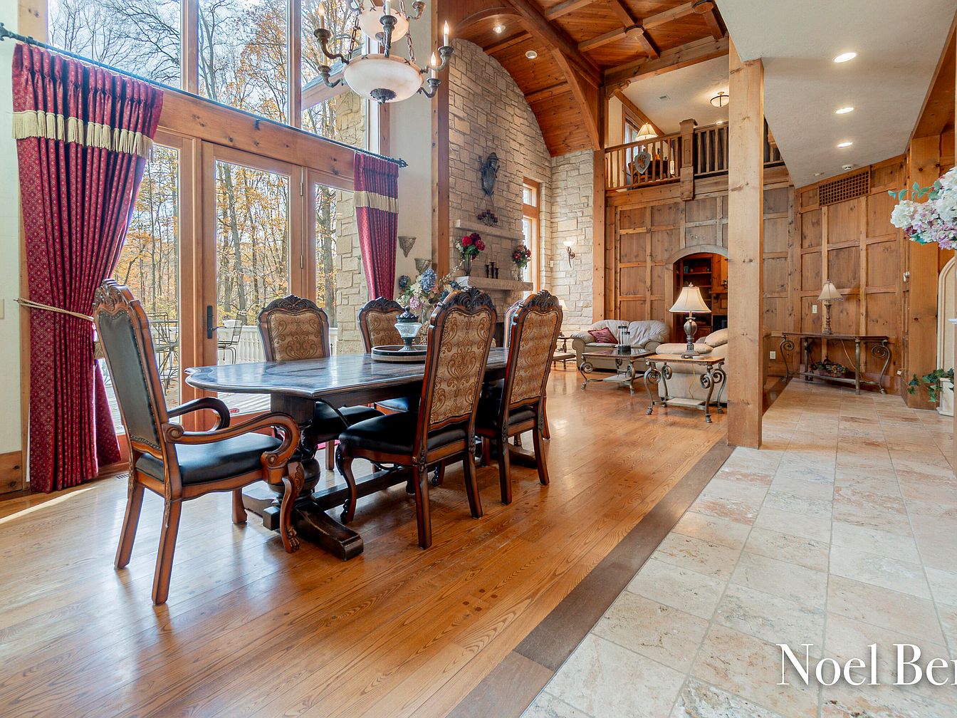 This stunning dining area features an expansive layout, highlighted by tall windows that invite natural light and offer views of the surrounding woods. The rich, hardwood flooring complements the rustic charm of the wooden beams overhead. A majestic table, surrounded by intricately designed chairs, serves as the centerpiece, perfect for family gatherings. Elegant burgundy drapes frame the windows, while a chandelier adds a touch of sophistication. The stone wall exudes warmth, seamlessly integrating with the room’s architectural details. This space balances style with comfort, making it ideal for both intimate dinners and lively entertaining.