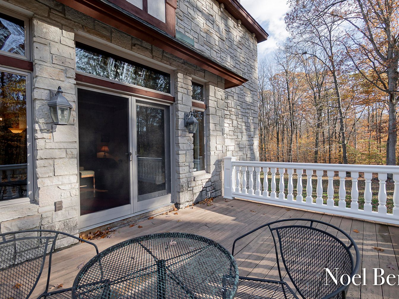 This charming outdoor patio offers a serene retreat, seamlessly blending indoor and outdoor living. The rustic stone exterior complements the natural surroundings, featuring detailed craftsmanship that enhances the home’s character. A spacious wooden deck provides ample space for relaxation, highlighted by black wrought-iron furniture that adds an elegant touch. The protective railing ensures safety while enjoying the view of the lush, wooded landscape. Ambient lanterns flanking the sliding doors exude warmth during evening gatherings. This space is perfect for family gatherings or quiet afternoons, inviting tranquility and connection with nature in a stylish setting.
