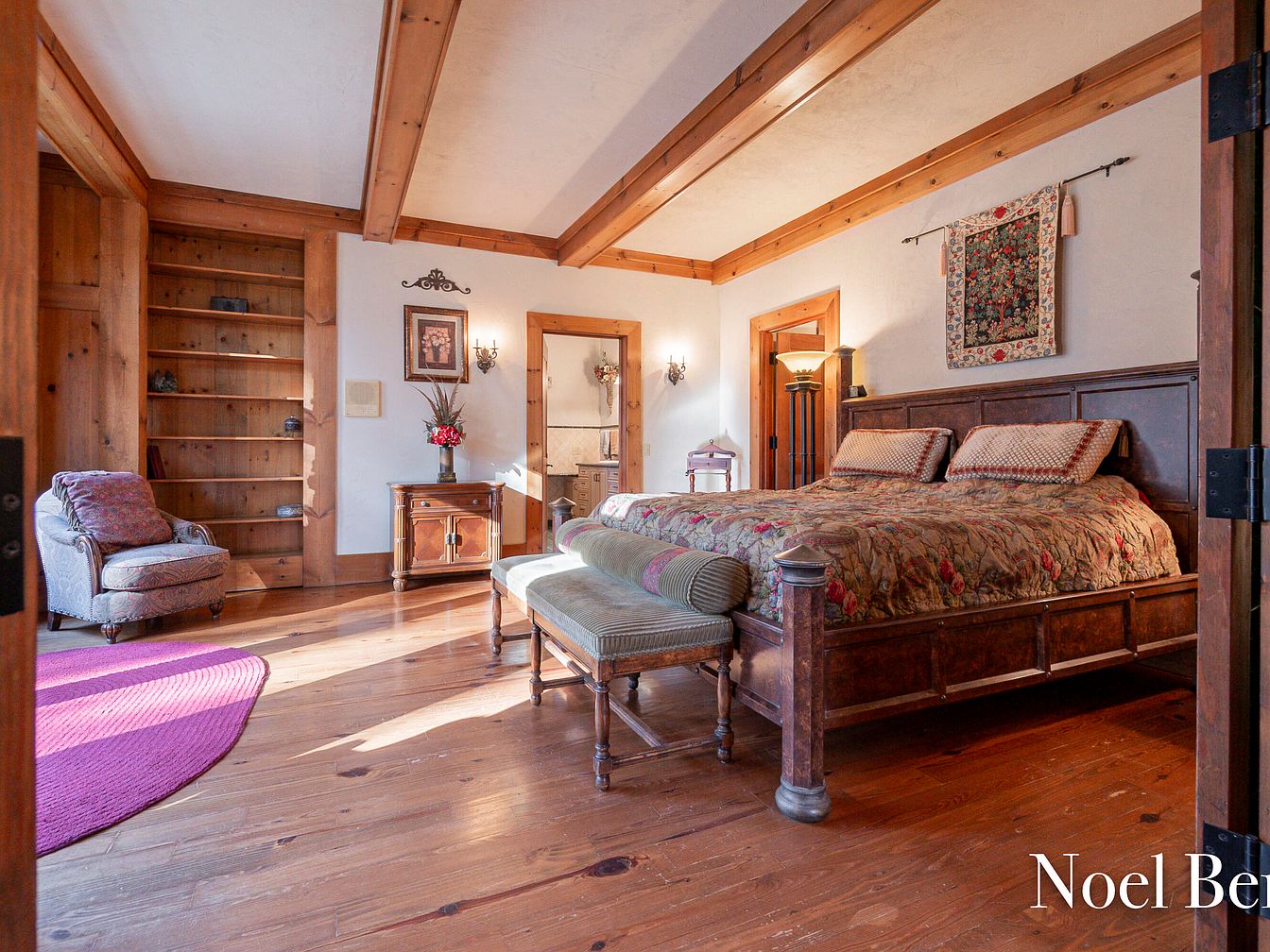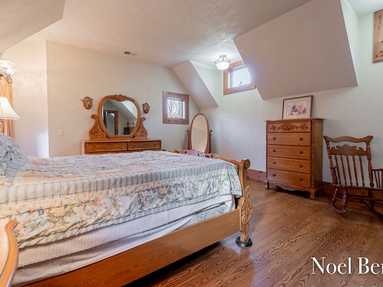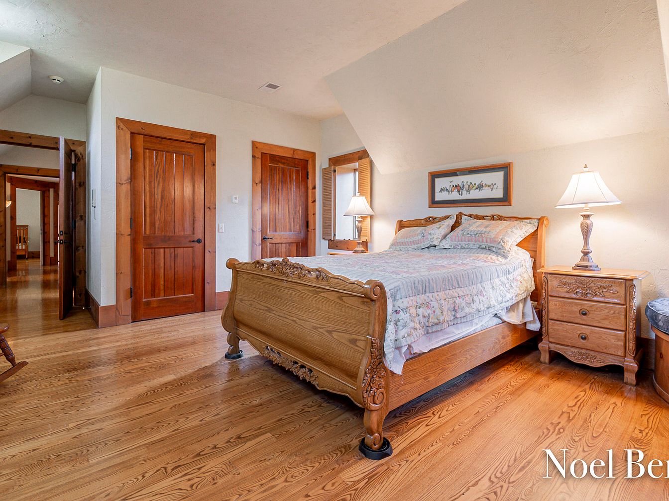 This serene master bedroom combines cozy elegance with rustic charm. The spacious layout features a beautifully carved wooden bed, flanked by ornate nightstands, each complemented by stylish lamps that create a warm glow. Rich wooden doors and trims add a touch of sophistication, harmonizing with the warm tones of the hardwood flooring. Soft, neutral wall colors enhance the inviting atmosphere, while the ceiling’s angled design adds architectural interest. Ample natural light filters through the windows, highlighting decorative accents, including framed artwork that brings character to the space. This bedroom promises relaxation and comfort, ideal for a family-friendly lifestyle.