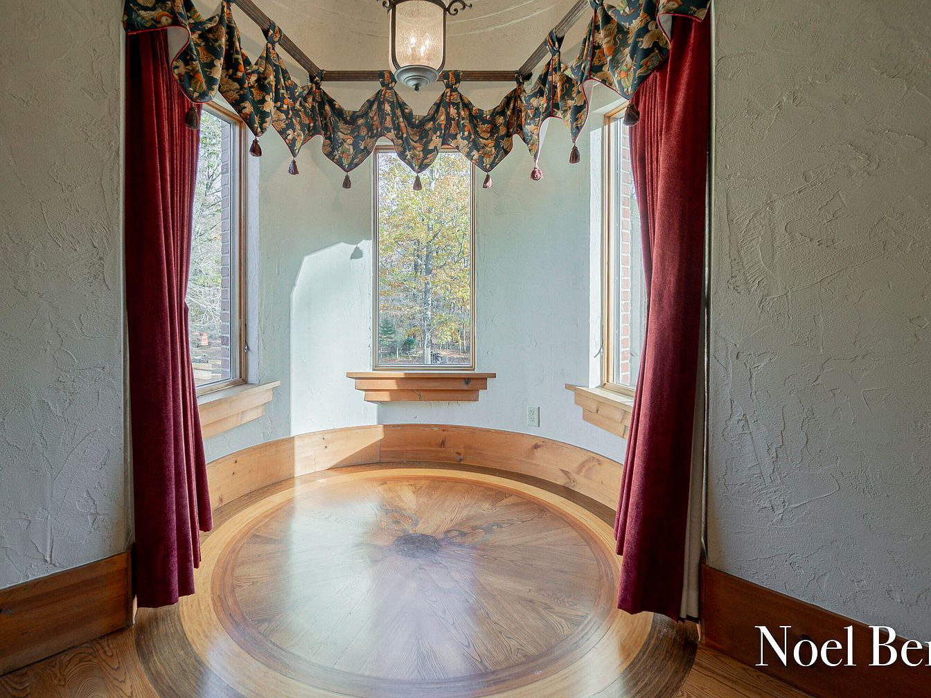 This charming nook features a circular design, highlighted by large windows framing views of the outdoors. Rich wooden accents define the space, with a beautifully polished hardwood floor that draws the eye to the room’s centerpiece. The windows are adorned with intricate valances and plush red drapes, lending warmth and an inviting atmosphere. A built-in wooden bench invites relaxation, perfect for reading or enjoying morning coffee. The soft, natural light creates a serene ambiance, making this space ideal for family gatherings or quiet moments. Cozy, yet spacious, it beautifully combines comfort with thoughtful design.