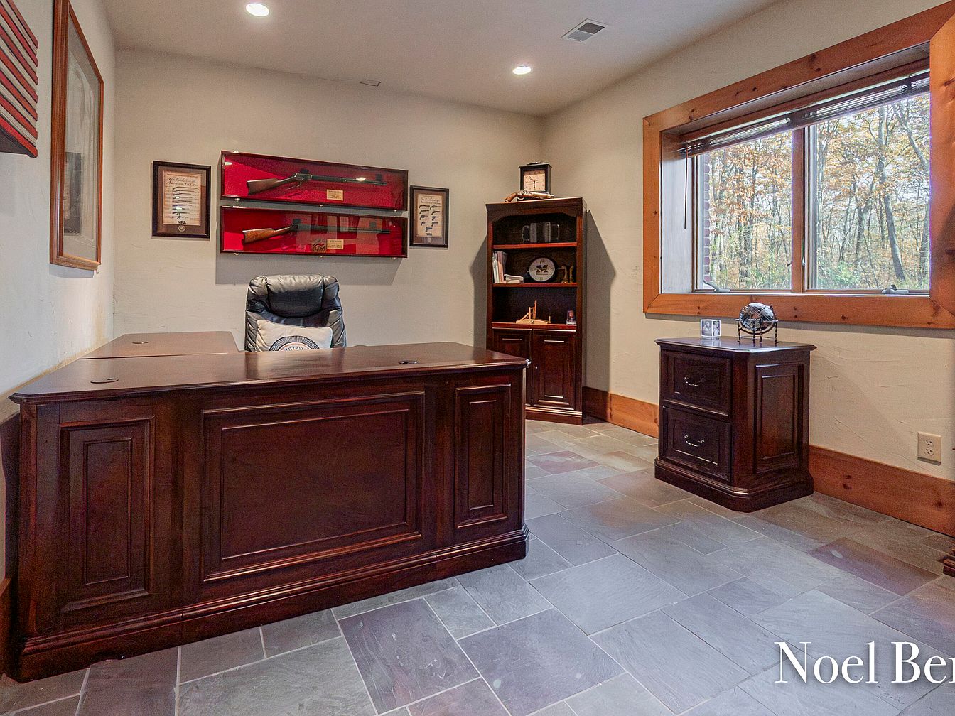 A beautifully designed home office that balances functionality with rustic charm. The rich, dark wood furniture creates a warm and inviting atmosphere, complemented by a sleek, leather office chair that ensures comfort during long hours of work. The spacious desk features intricate detailing, while the high-quality slate flooring adds a touch of elegance. Showcasing a vibrant window view of the surrounding nature, the room fosters a connection to the outdoors, enhancing productivity and tranquility. Thoughtful accents, including framed historical pieces and a stylish bookshelf, make this space not just practical, but an inspiring environment for creativity and focus.