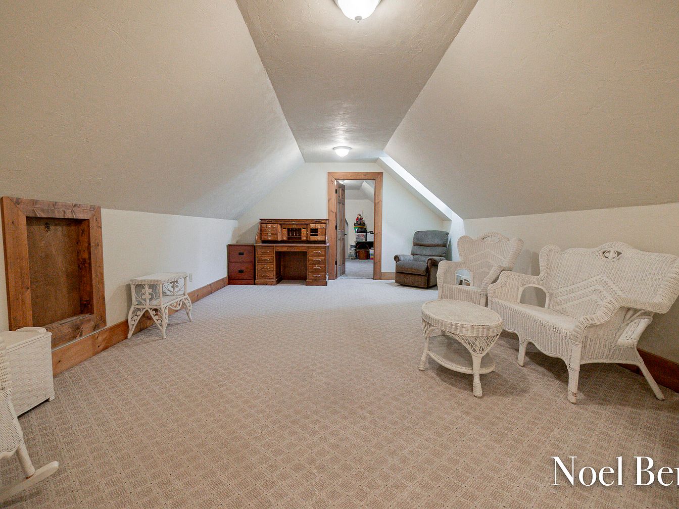 This charming attic space features a gently sloping ceiling that adds character and warmth. The soft beige walls, combined with plush carpeting, create an inviting atmosphere perfect for relaxation or creativity. Furnished with elegant white wicker chairs and a matching table, the space encourages casual gatherings. A sturdy wooden desk offers a functional workspace, while the natural wood trim highlights the home’s rustic aesthetic. Family-friendly touches include ample space for play or study, ensuring it accommodates various activities. The overall color scheme balances tranquility and cheer, making it an ideal nook for both work and leisure.