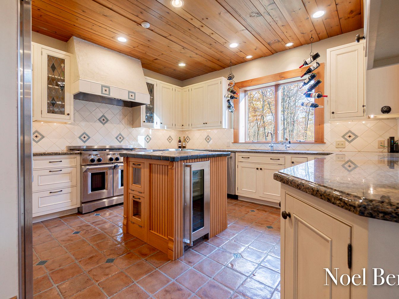 This charming kitchen exudes warmth with its rich wooden ceiling and classic design. The layout features elegant white cabinetry, detailed with glass accents, paired seamlessly with a large granite countertop that serves as both workspace and gathering spot. The natural clay tile flooring not only adds texture but is also practical for family cooking activities. A large window invites natural light while offering views of the surrounding greenery, enhancing the home’s connection to nature. Stylish stainless steel appliances promise efficiency, while the wine rack hints at entertaining potential, making this kitchen both functional and inviting.