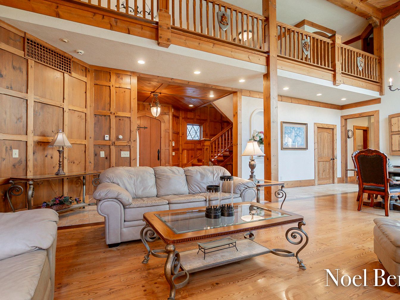 This inviting living room features rich wooden paneling and beams that evoke a sense of warmth and rustic charm. The spacious layout allows for family gatherings, centered around a plush, light-colored leather sofa. A glass-topped coffee table enhances the open feel, with elegant wrought iron detailing. Soft lighting from stylish lamps complements the natural light streaming through large windows, illuminating the honey-toned hardwood flooring. Architectural details, such as the intricate wooden railing above, add character and style while maintaining a family-friendly atmosphere. This space beautifully blends comfort with sophistication, perfect for everyday living and entertaining.