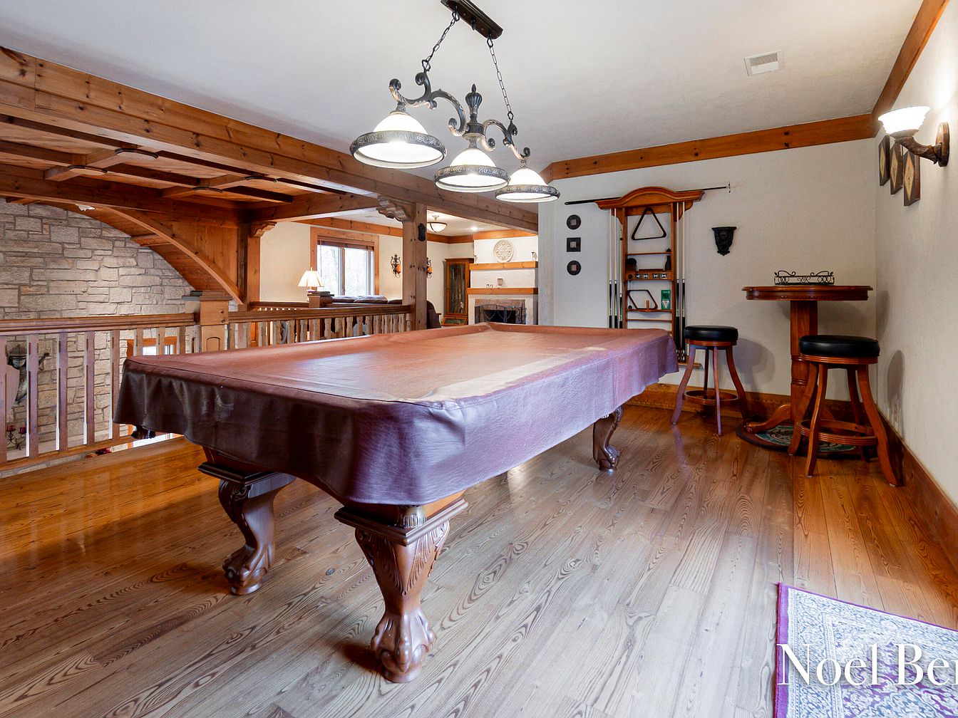 This inviting game room seamlessly merges comfort and sophistication with its warm wood tones and rustic charm. A majestic billiard table serves as the centerpiece, surrounded by detailed woodwork and exposed beams that highlight the space’s architectural character. Soft lighting from the stylish chandelier casts a warm glow, creating a cozy atmosphere for family gatherings. Barstool seating adds functionality, encouraging social interaction, while nearby shelves store cues and accessories for easy access. The natural wood flooring enhances the room’s inviting feel, complementing the tasteful decor and ensuring this space is perfect for entertaining friends or enjoying family game nights.