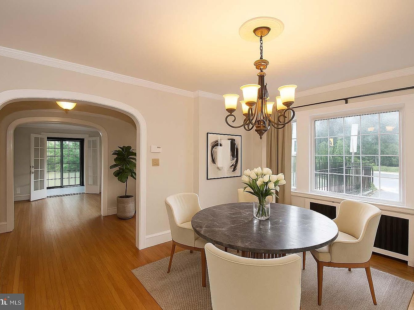 A charming dining room nook showcases a round marble table surrounded by four cushioned, mid-century-inspired chairs atop a soft, neutral rug. The large window floods the space with natural light, creating a bright and welcoming area perfect for family meals or game nights. Soft beige walls, white crown molding, and a dramatic wrought iron chandelier add warmth and elegance, while modern art and a vase of fresh tulips provide a stylish touch. The open arched doorway leads to an adjoining sunroom embraced by French doors, making this area both connected and inviting, ideal for comfortable family living.