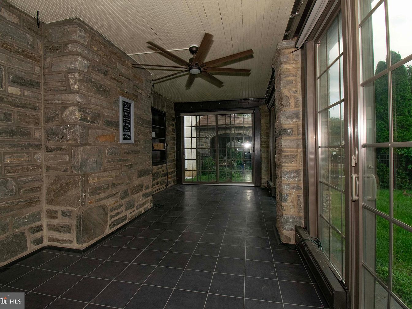 A spacious sunroom patio featuring rustic stone walls paired with sleek, dark floor tiles creates an inviting blend of traditional and modern styles. Large sliding glass doors on one side offer expansive views of the lush backyard, flooding the room with natural light and creating an indoor-outdoor feel perfect for family gatherings. The neutral tones of the stonework contrast beautifully with the crisp grid pattern of the floor, while the ceiling fan adds a functional and contemporary touch. This open, airy space is perfect for children to play, adults to relax, or entertaining guests all year round.