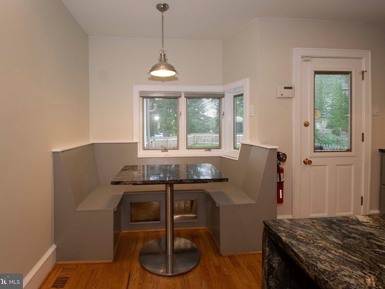 A cozy built-in breakfast nook offers a perfect family gathering spot, featuring bench seating wrapped around a square granite-topped table. Large picture windows flood the space with natural light and provide a pleasant view of the outdoor yard, ideal for both casual meals and morning coffee. The design emphasizes functionality and togetherness, ample bench space encourages easy conversation, while the pendant light above ensures a warm, well-lit atmosphere. Light gray and neutral wall tones blend with medium-toned hardwood floors to lend a contemporary yet inviting feel, with the adjacent backdoor adding practicality for busy family routines.