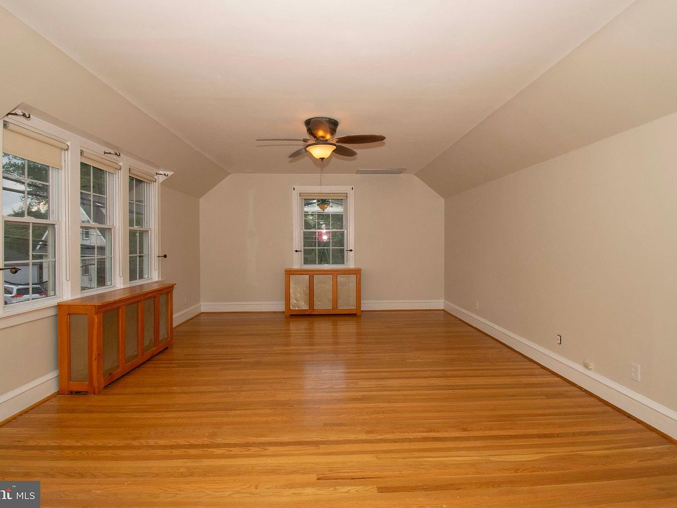 This inviting family room showcases a generous open layout perfect for gatherings and play. Warm, honey-toned hardwood floors flow throughout, complemented by soft beige walls that promote a calm, welcoming atmosphere. Three large windows line one wall, filling the space with natural light and providing scenic outdoor views, while built-in wooden cabinets offer functional storage for games, books, or electronics. The ceiling features both a fan and an elegant overhead light fixture, enhancing comfort and style. With its uncluttered design and ample floorspace, this room is ideal for both relaxing evenings and active family life.