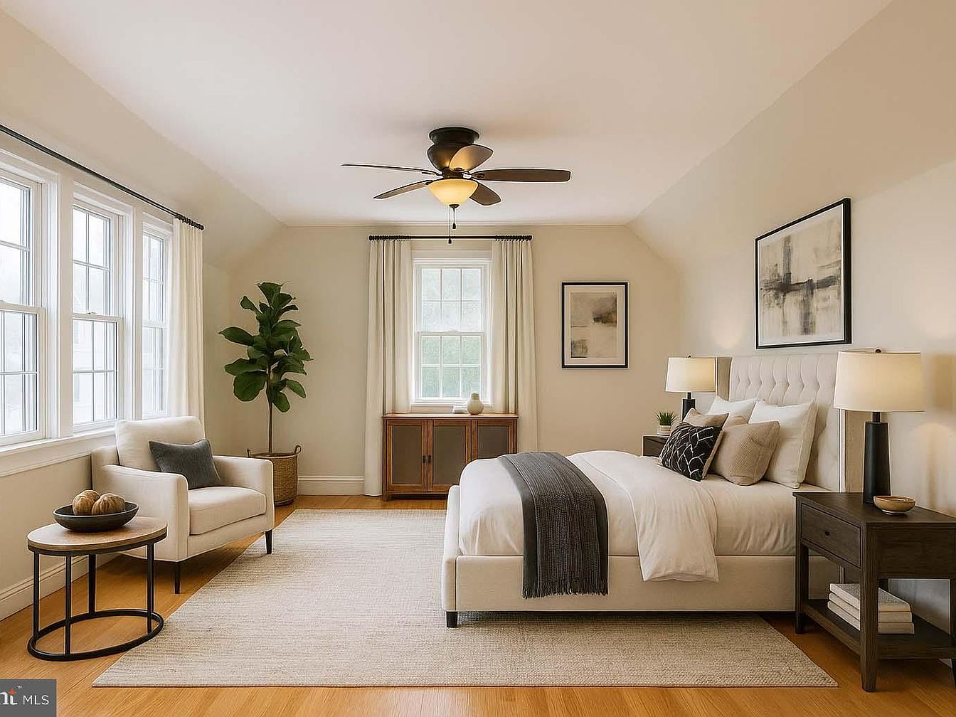 A serene bedroom featuring a soothing neutral color palette and abundant natural light streaming through large, multi-pane windows. The space is grounded by warm hardwood flooring, a plush area rug, and elegant white walls. The queen-sized bed, upholstered in tufted fabric, is flanked by matching nightstands with modern lamps, providing symmetry and balance. Comfortable seating is offered by an armchair and side table near the windows, ideal for reading or family conversations. Minimalist artwork, a leafy potted plant, and simple-yet-elegant decor create a relaxing ambiance perfect for both rest and spending time with loved ones.