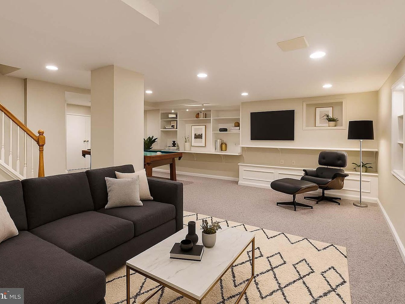 A spacious basement lounge showcasing a comfortable blend of family-friendly design and sophisticated style. Featuring a sectional charcoal sofa and a geometric area rug, this inviting space is perfect for gatherings or relaxation. Built-in shelves and cabinetry offer ample storage while recessed lighting adds warmth to the neutral palette of creams and soft beiges. A sleek Eames-style lounge chair sits beside a modern floor lamp, ideal for reading. The open layout includes a stylish pool table, making it great for entertainment. Natural wood accents from the staircase and thoughtfully placed decor complement the modern, organized look.