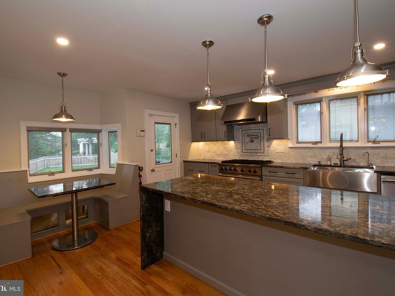 Spacious kitchen featuring a striking granite countertop island, ideal for gatherings and food preparation. Sleek gray cabinetry, stainless steel appliances, and modern pendant lighting add contemporary flair, while the neutral walls create a calming backdrop. A cozy built-in breakfast nook with a window view offers a family-friendly spot for casual meals, homework, or crafts. Rich hardwood floors provide warmth and contrast beautifully with the cool tones of the kitchen. The layout promotes both functionality and togetherness, with ample counter space, deep farmhouse sink, and large windows that maximize natural light and provide a connection to the outdoors.
