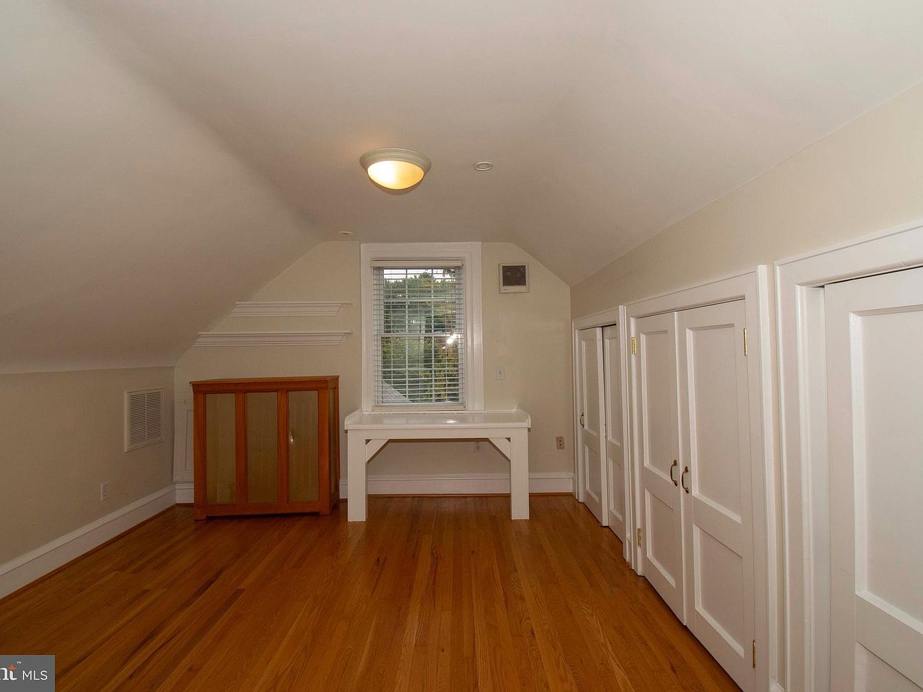 This inviting attic workspace features warm hardwood floors that complement the soft cream walls, creating a cozy and welcoming atmosphere. A window at the end of the room allows for ample natural light, ideal for reading or creative projects. Built-in storage closets line one wall, offering practical space for organizing family belongings, games, or seasonal clothing. The white trim and sloped ceiling add architectural charm, while a simple wooden cabinet and a clean-lined desk create functional work or study areas for both children and adults. This versatile space is perfect for a quiet home office, craft room, or homework zone.