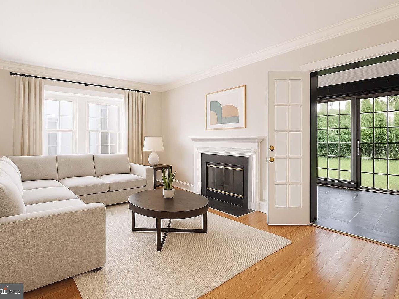 A bright and inviting living room features an open layout perfect for family gatherings, highlighted by a large sectional sofa positioned to take advantage of natural light from generously sized windows. The soft, neutral color palette of whites and beiges creates a calm, airy ambiance, while light wood flooring and a simple woven area rug add subtle warmth. A modern, minimalist coffee table anchors the space, complemented by a side table with a tasteful lamp. Centered on one wall is an elegant fireplace framed by crisp molding and topped with abstract art, while glass-paned doors open to a scenic sunroom with views of the lush backyard, ideal for indoor-outdoor living.
