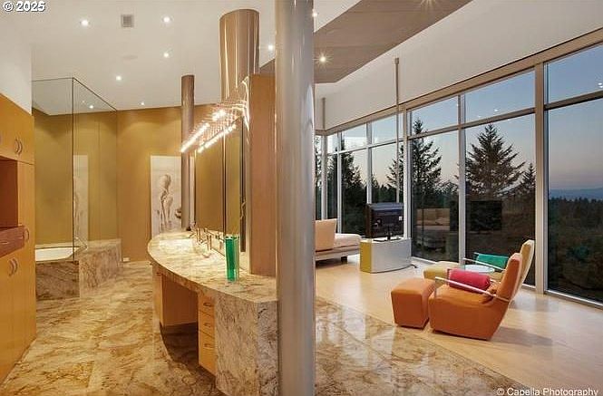 Spacious and airy, this master bathroom suite features floor-to-ceiling windows that flood the space with natural light and offer serene forest views. Sleek marble countertops and flooring create a sense of luxury, complemented by warm gold and beige tones throughout. Modern, minimalist cabinetry and lighting fixtures add a touch of elegance, while the open-plan layout connects seamlessly to a cozy seating area perfect for family gatherings or quiet relaxation. Plush, brightly colored lounge chairs invite comfort and conversation, blending playful accents with sophisticated design, making this room both functional and inviting for all family members.