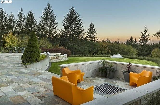Expansive stone-tiled patio with a sunken seating area perfect for relaxing or entertaining, surrounded by a lush lawn and framed by tall evergreens for privacy and natural beauty. Bold orange modern chairs add a playful pop of color and style, inviting conversation and family gatherings. Potted greenery and clean, angular architectural lines evoke a contemporary look while softening the space for comfort. The open design encourages outdoor activities, making it ideal for both kids and adults. The peaceful setting, with its sweeping views and restrained color scheme, creates a welcoming environment for all ages.