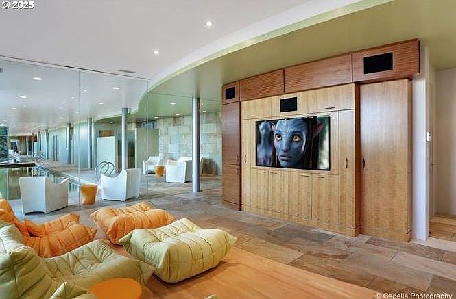 A spacious, open-plan media room with inviting pouf-style chairs in soft orange and green provides a laid-back, family-friendly atmosphere perfect for movie nights and gatherings. The large built-in wooden entertainment wall is the focal point, housing a generous flat-screen television. Contemporary glass walls and sleek support columns create a sense of openness, connecting the area seamlessly with an adjacent lounge space and offering ample natural light. The stone tile flooring adds natural texture and warmth, while low, modern seating encourages relaxation for all ages. A subtle green ceiling adds a pop of color, enhancing the lively, welcoming feel.
