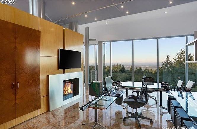 A spacious home office filled with natural light, thanks to expansive floor-to-ceiling windows that provide breathtaking panoramic views of the surrounding forest and distant landscape. The room features a sleek, modern aesthetic with glass desks, ergonomic office chairs, and a contemporary fireplace set in a light, minimalist surround beneath a mounted television. Rich, glossy marble floors add an air of luxury, while light wood paneling introduces warmth. The open layout offers ample workspace for multiple users, making it perfect for families who work or study from home together. Subtle recessed lighting enhances the serene and productive environment.