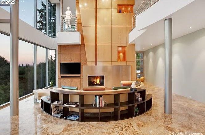 Modern, open-concept living room with floor-to-ceiling windows offering panoramic views of the surrounding forest and sunset sky. The space is filled with natural light, highlighting the polished marble floors and sleek, contemporary furnishings. A curving, cream-colored sectional sofa creates a cozy gathering spot around a fireplace set in striking wood-paneled walls. A yellow chaise lounge and stylish accent chairs add both comfort and pops of color, perfect for family relaxation or entertaining. Minimalist décor, an open staircase, and abundant shelving for books and photos make this space inviting, family-friendly, and visually striking with its warm-toned, airy atmosphere.