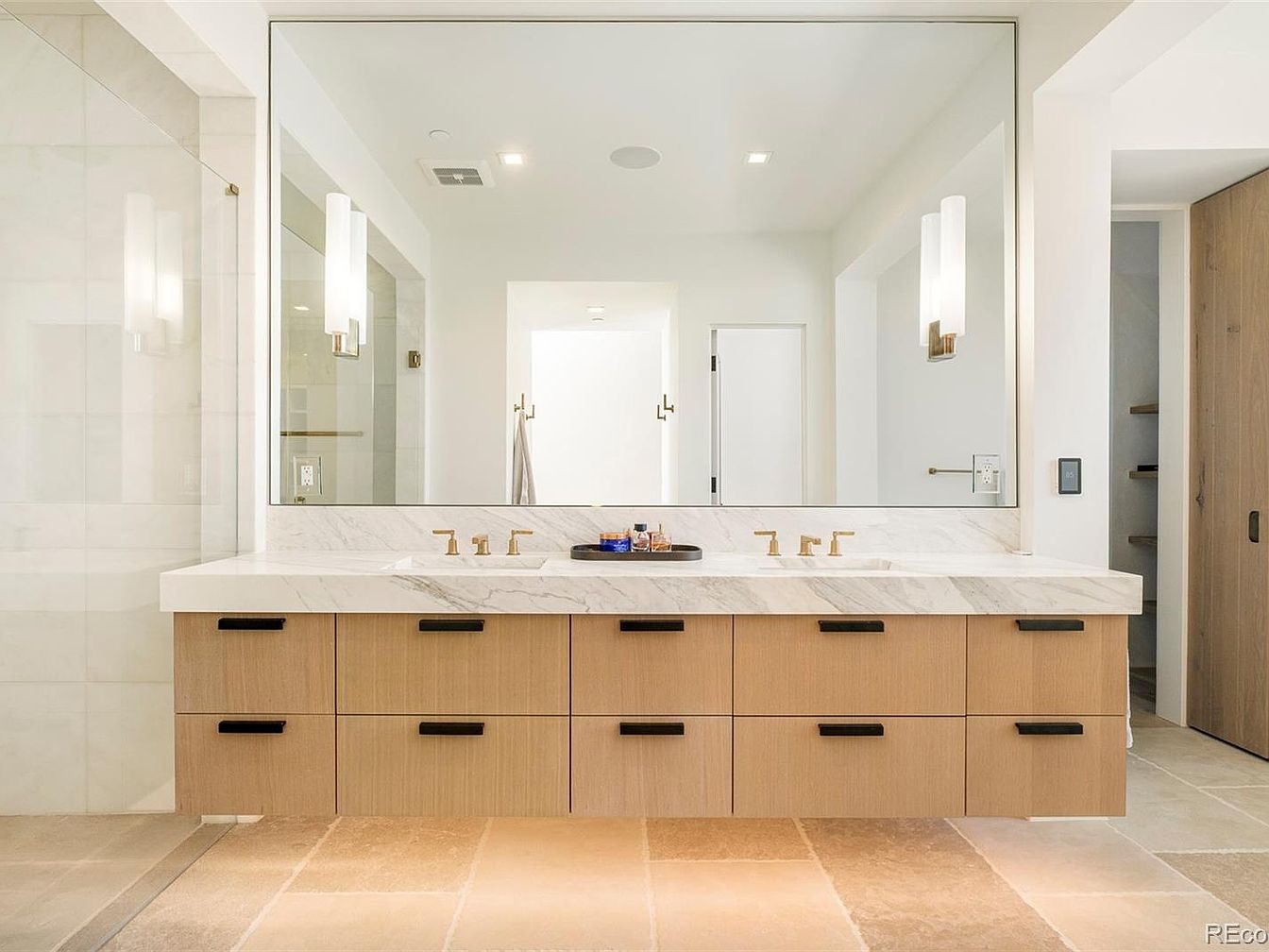 A spacious and elegant double vanity forms the focal point, featuring light wood cabinetry with sleek black handles for a modern touch. The crisp, white quartz countertop seamlessly blends with the under-mounted dual sinks and contemporary gold fixtures, giving a sense of understated luxury. A full-height mirror amplifies natural light, while vertical sconces on either side provide soft, even illumination. The neutral palette, with creamy beige floor tiles and white walls, creates a serene, airy atmosphere. Practical drawer storage and wide counter space are ideal for busy families, fostering both organization and a clutter-free, family-friendly bathroom retreat.