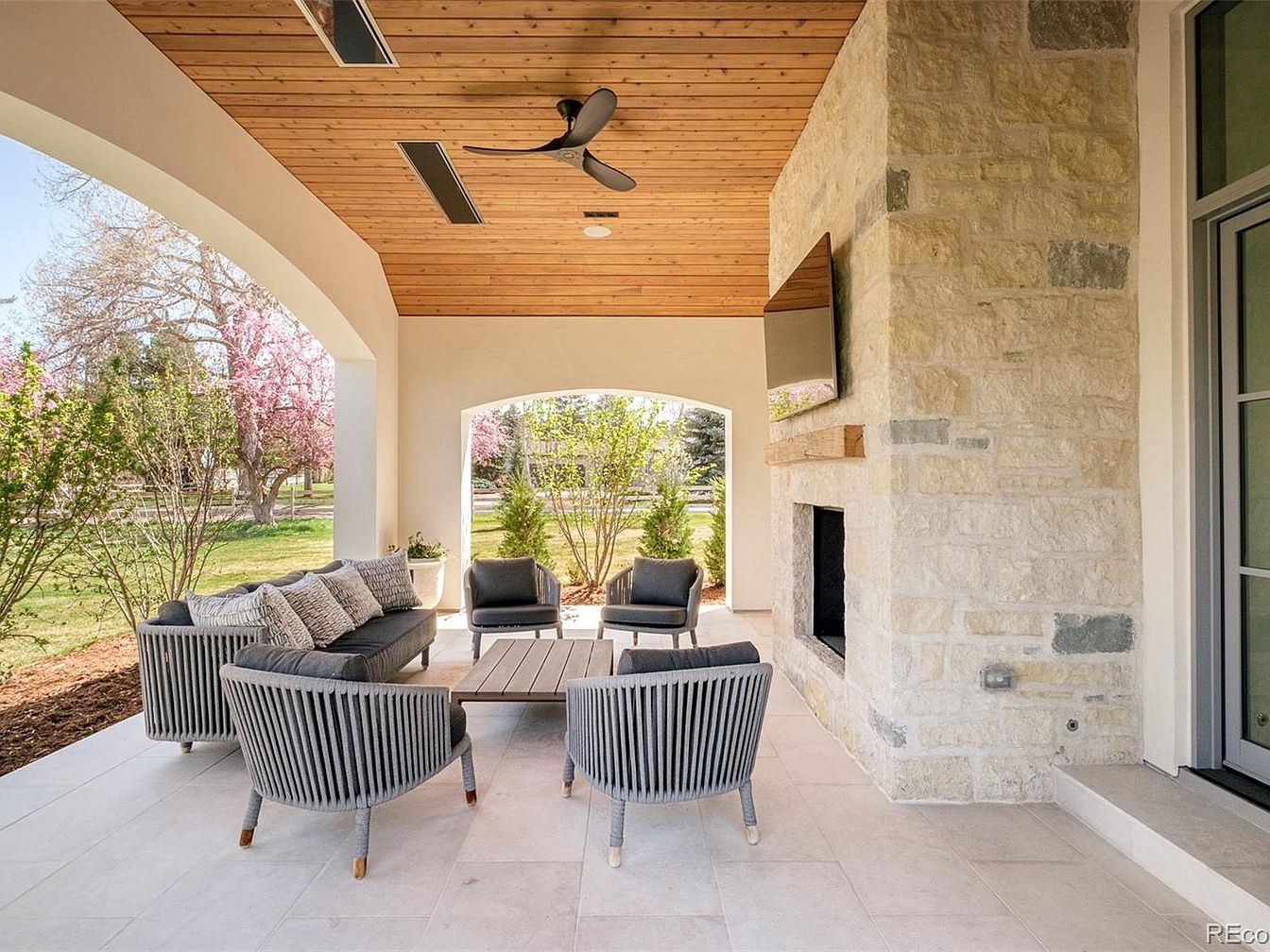 A beautifully designed covered patio features a spacious lounge area perfect for family gatherings or entertaining guests. The seating arrangement includes a modern grey sofa and four matching armchairs, complemented by a simple wooden coffee table. Warmth and style are added with a stone fireplace and a mounted TV, making the space suitable for year-round use. The wood-paneled ceiling, fitted with a contemporary fan and heaters, contrasts elegantly with the light stone flooring and walls. Large archways frame views of the lush green yard and blooming trees, seamlessly blending indoor comfort with an inviting outdoor atmosphere.
