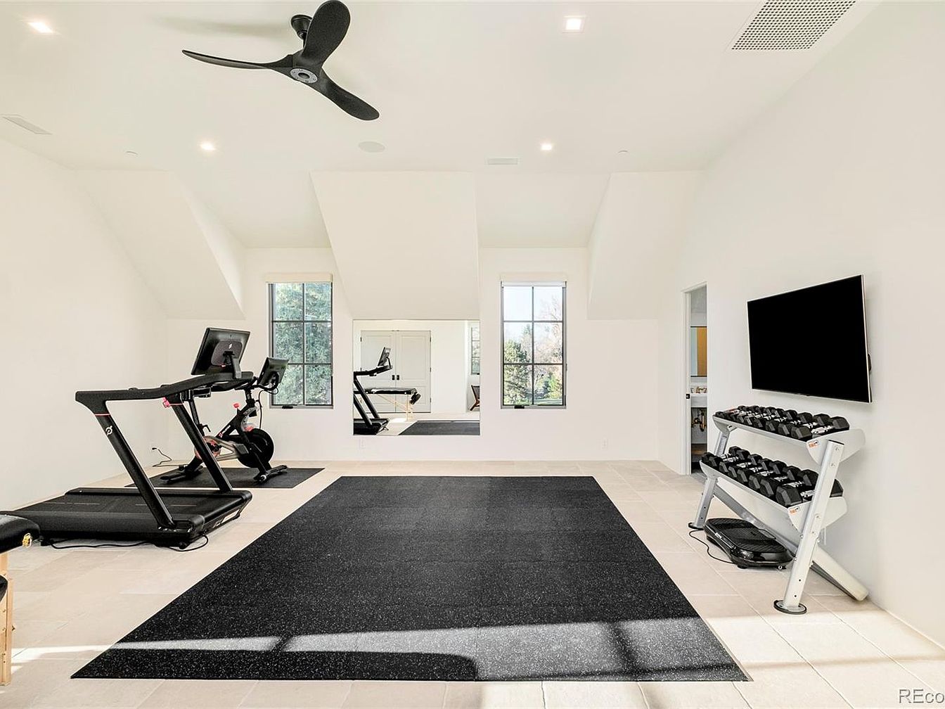 A spacious, light-filled home gym offers a clean and modern design ideal for a healthy family lifestyle. Large windows let in abundant natural light, creating an uplifting environment for workouts. The sleek black and white color scheme is complemented by neutral floor tiles and bold rubber mats that provide safe traction for any activity. High-end equipment includes a treadmill, stationary bike, free weights, and a wall-mounted television for entertainment or guided classes. Thoughtful layout ensures enough space for multiple users, making it perfect for families to exercise together, while mirrors visually expand the space, encouraging motivation and proper form.