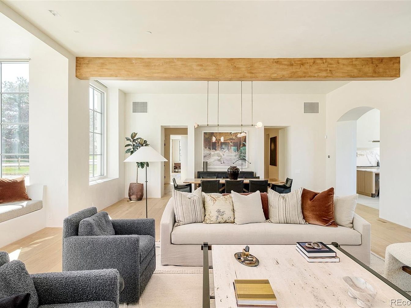 A beautiful open-plan living and dining space defined by light, natural wood flooring and high ceilings with a striking wood beam accent. Large windows flood the room with daylight and offer views of green outdoor scenery, making the space family-friendly and inviting. The living area features a plush, neutral-toned sofa with a mix of textured and earth-tone throw pillows, complemented by cozy, modern armchairs. A sleek travertine coffee table, built-in window seating, and a statement floor lamp add functionality and comfort. The adjacent dining area comfortably seats a large group, ideal for gatherings and family meals.