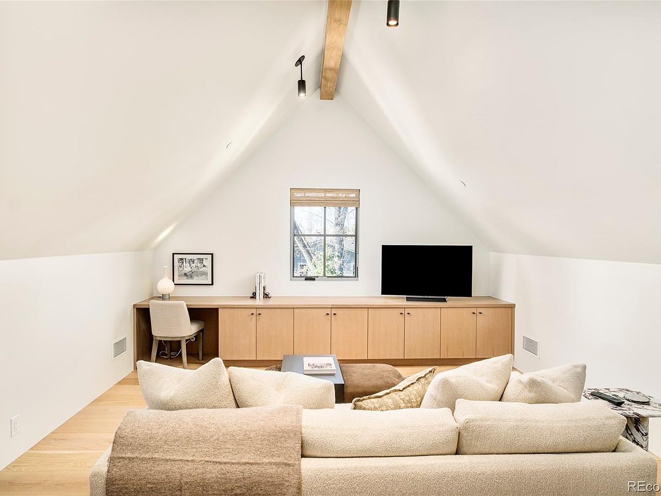 A beautifully bright loft area with sloped ceilings accented by white walls and a natural wood beam, creating a warm and airy feel. The space features a large, cozy sectional sofa perfect for family gatherings or movie nights, paired with neutral and earthy tone pillows. Against the far wall, a custom built-in media console provides abundant storage and serves as both a TV stand and a work area, complete with a desk nook and chair for homework or remote work. Wide-plank light wood flooring enhances the inviting, modern ambiance, making this loft an ideal multi-functional space for all ages.