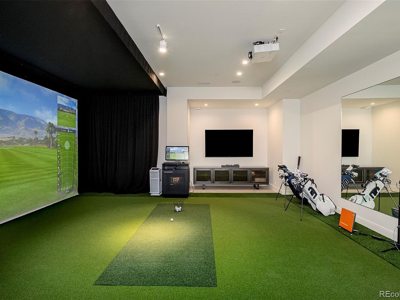 Immerse yourself in a dedicated golf simulator room designed for family fun and practice. The space features sleek artificial turf covering the floor, mimicking the feel of a fairway while providing a safe, cushioned environment for all ages. Modern amenities include a large projection screen for realistic virtual golf experiences, a cozy entertainment nook with a wall-mounted television, and ample lighting that brightens the streamlined, white-painted walls. Golf bags lined neatly by the mirrored wall add a sporty aesthetic and convenience for players. This recreation area combines high-tech entertainment with an inviting, family-friendly design perfect for gatherings or solo play.