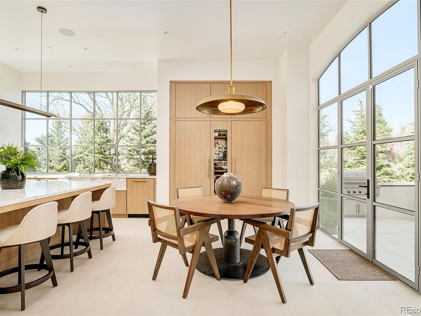 A spacious open-concept dining area seamlessly connects to the kitchen, framed by floor-to-ceiling windows that fill the space with natural light and offer tranquil views of the garden. The round wooden table with woven-backed chairs creates an inviting spot for family meals, while the sleek island and comfortable barstools promote easy gathering and conversation. Soft neutral tones with light wood cabinetry, crisp white countertops, and contemporary pendants add warmth and elegance. The glass doors open to the patio, making indoor-outdoor dining effortless, and the airy layout ensures this space is both practical and welcoming for family living.