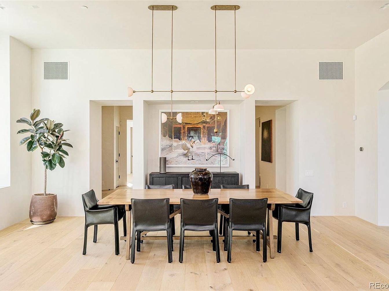 A spacious, modern dining room features a long wooden table surrounded by eight sleek black chairs, offering ample seating for family gatherings or entertaining guests. The room is bright and airy, thanks to large windows and a pale, neutral color palette on the walls and wide-plank wooden floors. An elegant, linear chandelier hangs overhead, adding a contemporary touch. A single piece of modern art creates a sophisticated focal point above a low black console along the far wall. The inclusion of a potted plant in a corner introduces a fresh, organic element, making the space inviting and family-friendly.