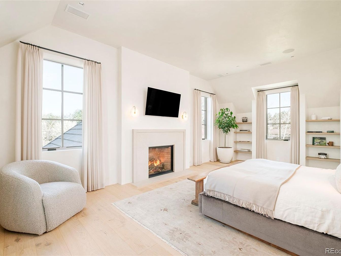 Bright and airy, this master bedroom offers a soothing sanctuary for relaxation and family moments. Clean architectural lines are complemented by tall windows draped in soft beige curtains, allowing natural light to fill the space. The central fireplace brings warmth and comfort, topped by a sleek mounted television ideal for cozy evenings. Neutral walls and light wood flooring evoke a calming atmosphere, while the plush area rug and upholstered chair invite quiet reading or cuddling. Built-in shelves provide display and storage space. Accents like the large potted plant integrate touches of nature, crafting a peaceful, family-friendly environment.