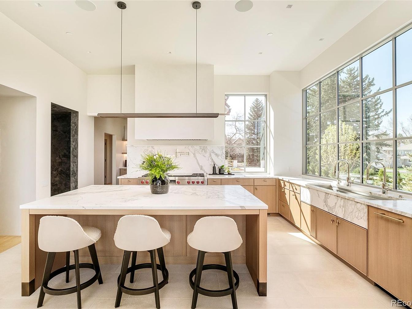 A sun-filled kitchen features a stunning marble island with comfortable seating for casual family meals or entertaining guests. The open layout flows seamlessly with natural oak cabinetry and elegant waterfall countertops, providing ample workspace and storage while maintaining a warm, inviting feel. Expansive floor-to-ceiling windows allow an abundance of natural light, enhancing the bright, airy atmosphere and offering views of the surrounding greenery. Clean lines, minimalist fixtures, and soft ivory walls create a calm, modern aesthetic. The spaciousness and thoughtful design make this kitchen ideal for both everyday family life and special gatherings, balancing style with practical functionality.