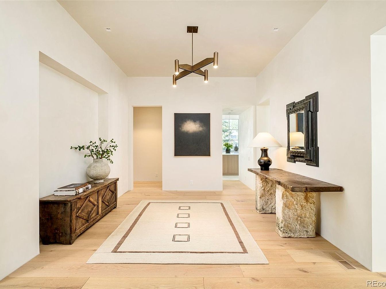 A spacious entryway with light hardwood floors and soft white walls welcomes guests with a calming, minimalist atmosphere. The space features a rustic wooden bench topped with a large decorative vase, ideal for storing shoes or bags for a family on the go. A natural stone and wood console table paired with a modern black framed mirror offers both elegance and practicality. Overhead, a geometric contemporary light fixture creates visual interest, while a neutral-toned area rug softens the space for little ones. Subtle wall art and glimpses into adjoining rooms hint at an open-concept, family-friendly layout.