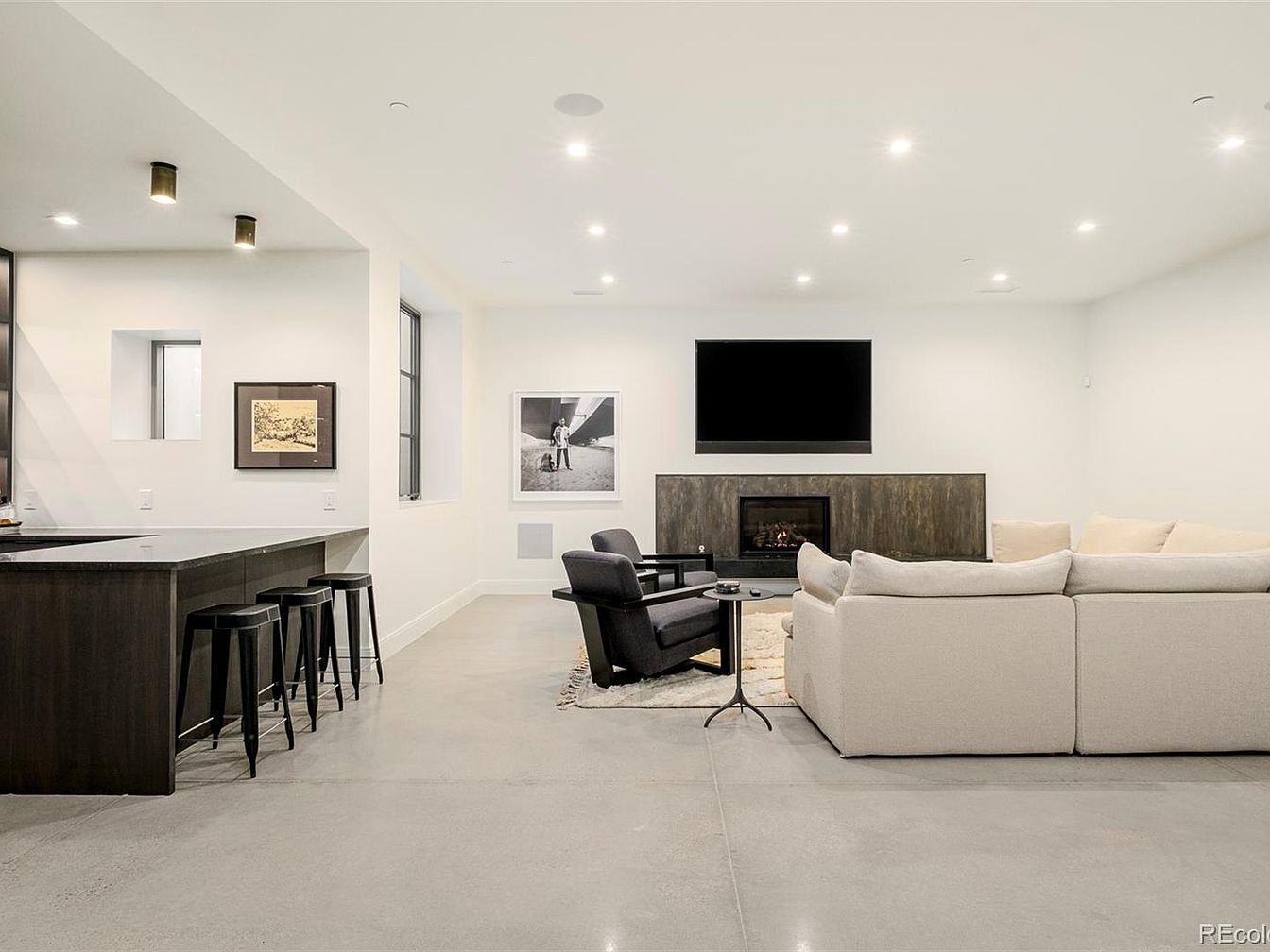 A spacious open-concept living room seamlessly blends with a sleek bar area, creating the ideal space for both family gatherings and casual entertaining. The neutral color palette features soft white walls and polished concrete floors, setting a modern yet inviting tone. A large sectional sofa, perfect for lounging, faces a contemporary fireplace with a mounted TV above, creating a cozy focal point. Black barstools line the minimalist dark countertop, offering additional seating for kids or guests. Artwork, large windows, and recessed lighting infuse brightness, while simple furnishings and uncluttered lines ensure the area remains both practical and welcoming for family life.