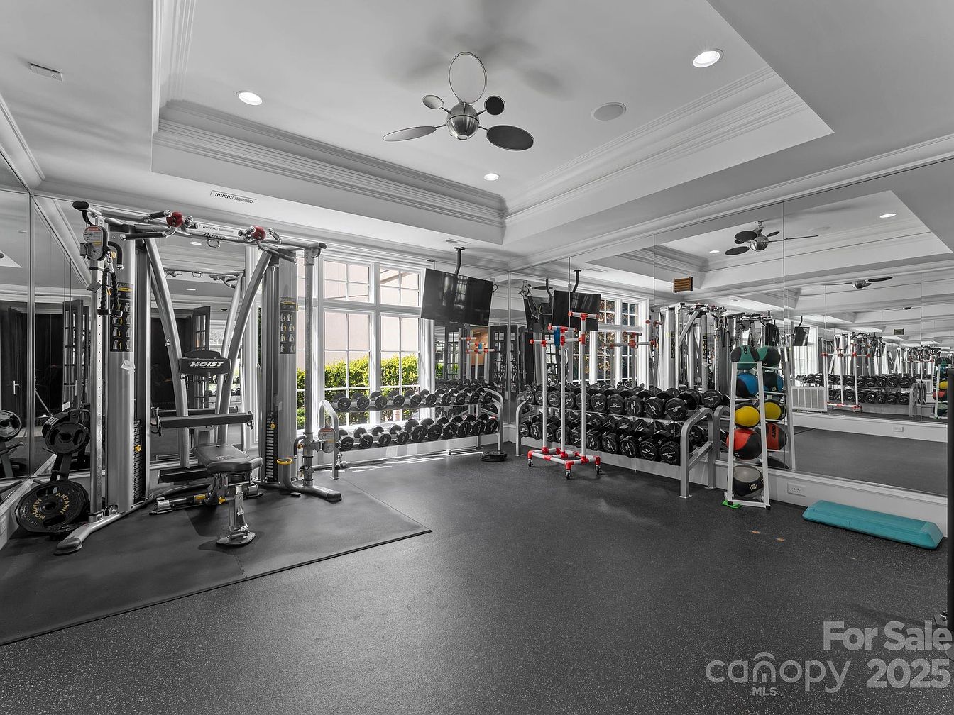 This spacious home gym effortlessly combines functionality with elegance. The room boasts an open layout with expansive mirrors that create an illusion of depth, enhancing the experience while working out. A sleek range of weights and machines align against the polished walls, complemented by vibrant exercise balls for a pop of color. Natural light floods through large windows, brightening the space and invigorating workouts. The subdued yet sophisticated color palette, along with ceiling fans and recessed lighting, ensures comfort during exercise sessions. This setup exemplifies a perfect blend of style and utility for the whole family.