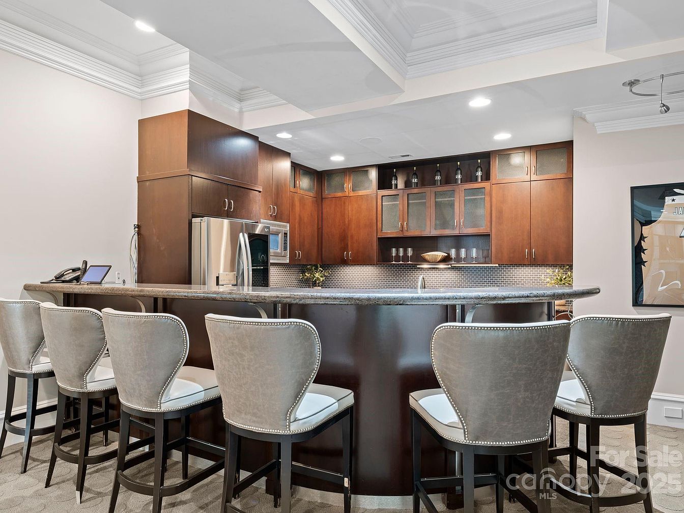The spacious kitchen bar area features rich, dark cabinetry complemented by sleek granite countertops, creating an elegant and inviting atmosphere. High-backed bar stools upholstered in soft grey fabric provide comfortable seating, while their metallic accents enhance the contemporary design. The thoughtfully arranged layout encourages family gatherings, making it a perfect spot for casual meals or entertaining guests. The polished tile backsplash adds a modern touch, reflecting light beautifully. Crown molding adorns the ceiling, elevating the aesthetic appeal, while warm lighting creates a cozy ambiance. This space harmonizes functionality and style, making it ideal for family interactions.
