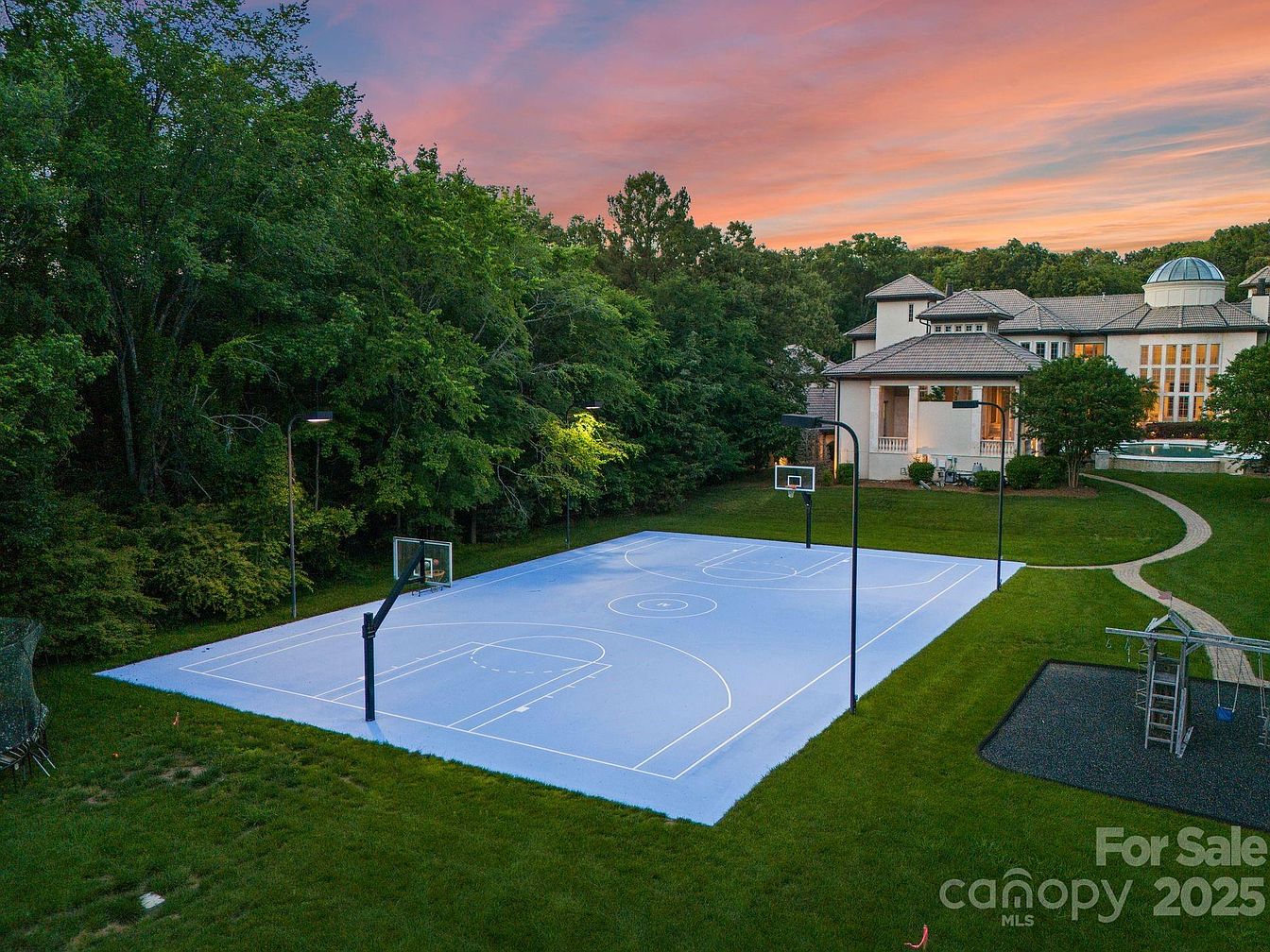 A pristine, multi-functional sports court offers vibrant blue flooring, perfectly designed for basketball enthusiasts and active families. Flanked by lush greenery, this outdoor space showcases the harmonious blend of recreation and nature. The court’s thoughtful layout includes adjustable basketball hoops and ample lighting for evening play, fostering a lively atmosphere. Adjacent to the court, a modern swing set complements the family-friendly environment, encouraging both children and adults to enjoy outdoor activities. The expansive lawn and meandering pathways enhance the overall tranquility, creating an inviting area for gatherings and leisure, while the backdrop of the elegant home adds sophistication.