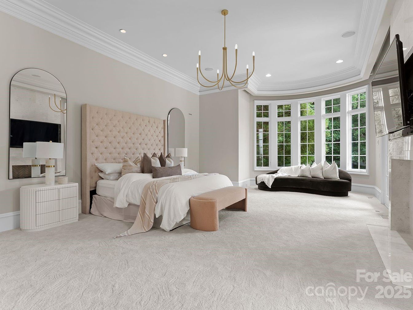 This luxurious master bedroom features a spacious layout designed for relaxation and comfort. A stunning tufted headboard serves as the centerpiece, complemented by elegant bedside tables with chic lamps. The warm, neutral color palette of soft beige and white promotes tranquility, while natural light floods in through expansive bay windows, offering a serene view of the landscaped garden outside. A plush area rug adds warmth to the carpeted floor, creating a cozy atmosphere. The semi-circular seating area, adorned with fluffy pillows, invites casual lounging, making this space perfect for family retreats or unwinding after a long day.