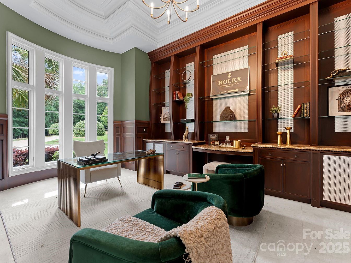 This sophisticated home office combines luxury and functionality with a striking design. The space features an elegant glass desk accented by a gold base, paired with plush, deep green chairs that invite comfort during work hours. Large bay windows flood the room with natural light, offering picturesque views of the landscaped garden outside. Rich mahogany cabinetry lines the walls, showcasing stylish décor and books, while a refined color palette of earthy greens and rich browns creates a calming atmosphere. Thoughtfully designed shelving and meticulous architectural details, like the coffered ceiling, add an air of sophistication, making this office perfect for productivity.