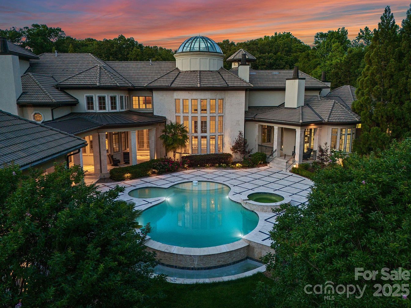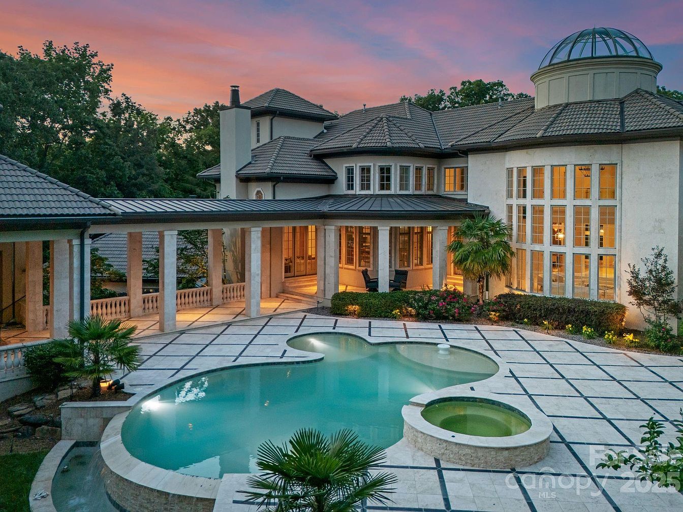 This stunning poolside area invites relaxation with its unique shape and serene ambiance. The turquoise water glistens under the evening sky, complemented by elegant stone decking that provides ample space for lounging. Surrounding lush tropical plants enhance the tranquil atmosphere, creating a perfect retreat for family gatherings or quiet evenings. The grand architecture of the home features a beautiful blend of tall windows and a distinctive dome, allowing natural light to flood in. With easy access to indoor living spaces, this outdoor oasis effortlessly combines luxury with family-friendly functionality, making it an ideal setting for living and entertaining.