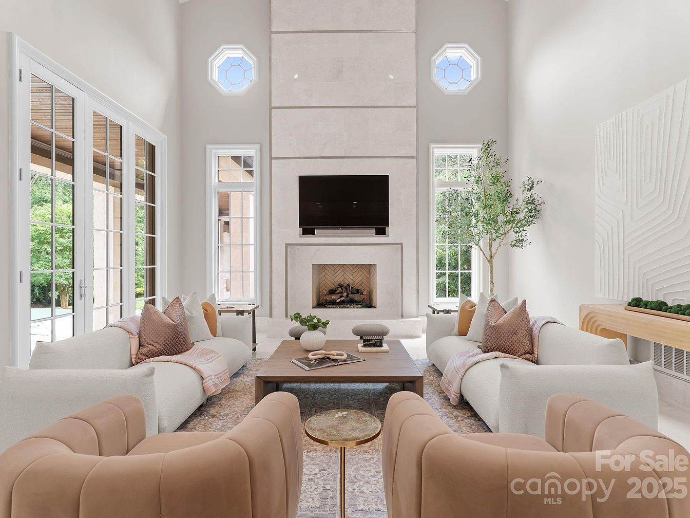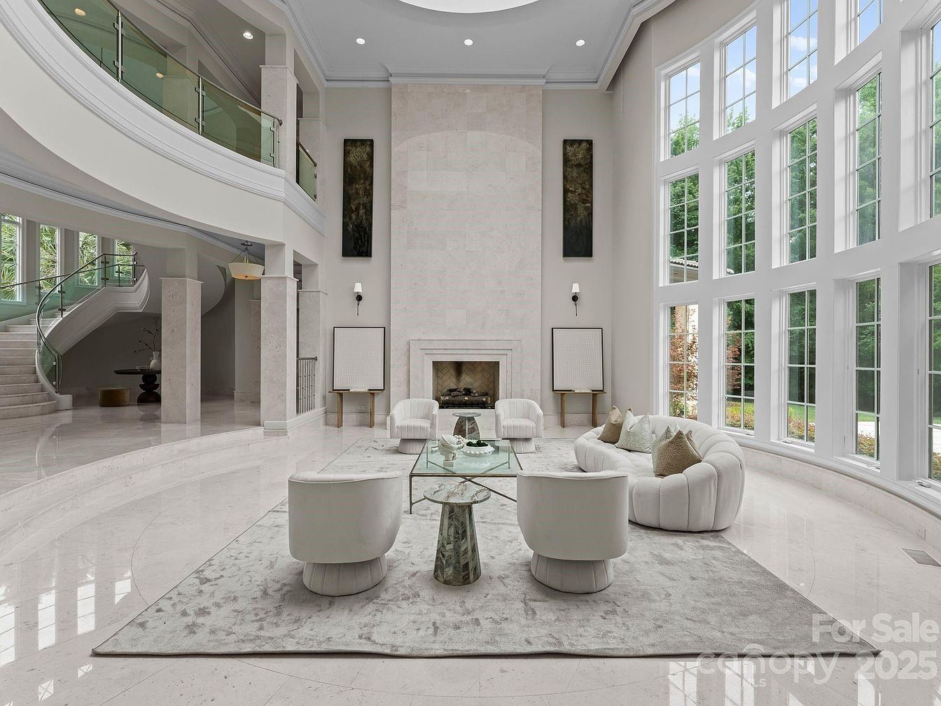 Featuring a spacious layout, the grand living room exudes elegance with its soaring ceilings and generous natural light flooding through expansive windows. The soft beige color palette harmonizes beautifully with polished marble flooring, creating a warm yet sophisticated atmosphere. A plush area rug anchors the seating arrangement, which consists of modern, curved sofas and chic accent chairs, inviting comfort and conversation. Architectural details such as the fireplace and artwork add character, while the open design fosters a sense of community and flow. This space is perfect for family gatherings, blending style and functionality seamlessly.