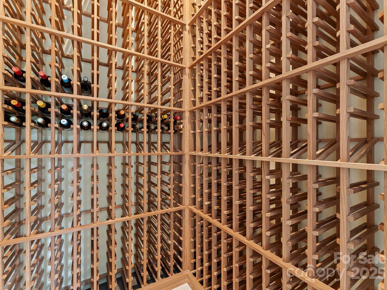 This exquisite wine cellar showcases a sophisticated design, perfect for any wine enthusiast. The layout features custom-built wooden racks, allowing for optimal organization and easy access to various bottles. Rich, warm tones of the wood enhance the aesthetic, offering a cozy yet elegant atmosphere. With capacity to accommodate numerous bottles, it blends functionality with style. The clean lines and strategic placement of the wine racks create a visually striking display. This space not only serves as a storage solution but also doubles as an inviting area for tastings, making it a family-friendly feature for entertaining guests.