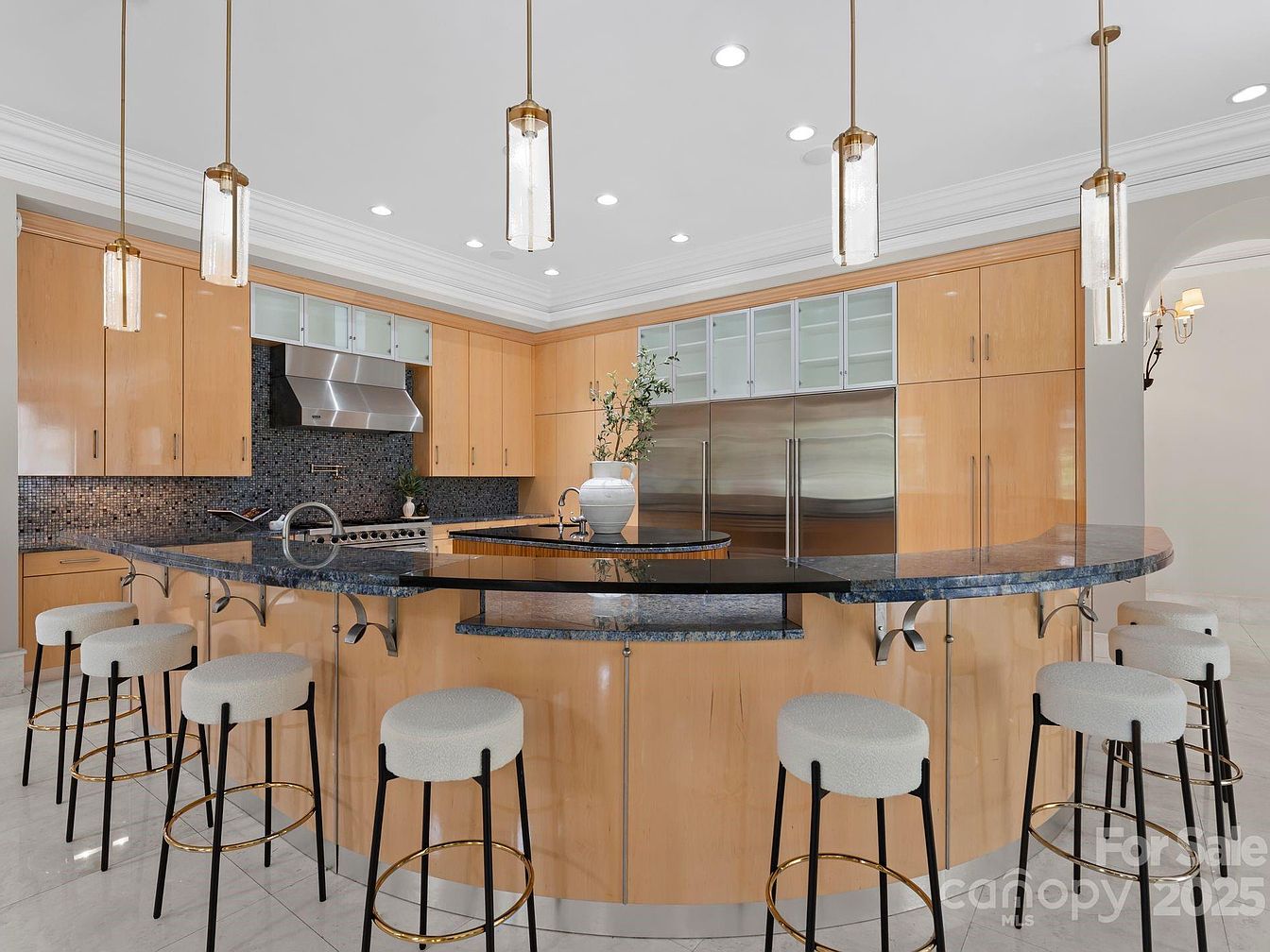 This modern kitchen showcases a spacious, open layout with sleek, light wood cabinetry that complements the dark granite countertops. The unique curved island, featuring stylish barstools with soft upholstery, invites social interaction, making it perfect for family gatherings. Bright pendant lights hang elegantly above, adding a touch of sophistication, while the stainless steel appliances and mosaic backsplash provide both functionality and visual appeal. A neutral color palette creates a warm, inviting atmosphere, enhanced by abundant natural light. Thoughtfully designed for culinary enthusiasts, this kitchen balances contemporary aesthetics with practical family-friendly features.