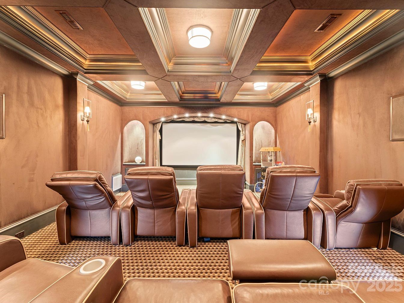 Immerse yourself in this luxurious home theater, designed for both comfort and style. The warm brown color palette envelops the space, complemented by plush reclining leather chairs arranged for optimal viewing. A sophisticated coffered ceiling with subtle ambient lighting enhances the elegance, creating an inviting atmosphere. Architectural details such as decorative wall sconces and rounded niches add a sense of refinement. The plush carpeting, featuring a unique pattern, offers a cozy underfoot feel. Notable family-friendly features include easy access to snacks with a vintage popcorn machine nearby, making this space ideal for unforgettable movie nights.