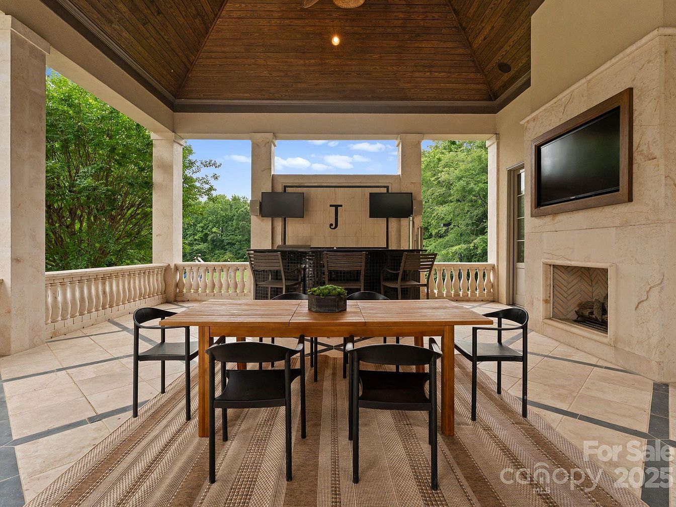 This stunning outdoor living space seamlessly blends luxury and comfort, perfect for family gatherings. The spacious seating area, anchored by a rustic wooden dining table, invites communal meals amid nature. Sleek black chairs complement the contemporary design, while a wide fireplace adds warmth and charm. Architectural details like the vaulted wooden ceiling enhance the area, exuding elegance. Large windows offer a picturesque view of the lush surroundings, ensuring natural light floods the space. Additional features include a mounted television, ideal for outdoor entertainment, and a cozy rug that ties the design together, making it a welcoming retreat.